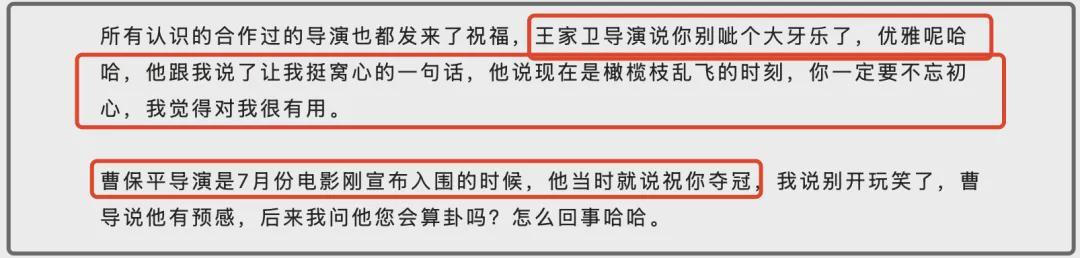 还有王家卫导演,虽然也祝福了辛芷蕾,但也提醒了她,拿了影后资源肯定今非昔比,现在是橄榄枝乱飞的时候,王家卫让辛芷蕾一定不要忘记初心。曹保平导演也像是会占卜一样,早在7月份电影入围的时候就预祝辛芷蕾夺冠,看来从电影人的角度,大家都觉得辛芷蕾能拿影后。
