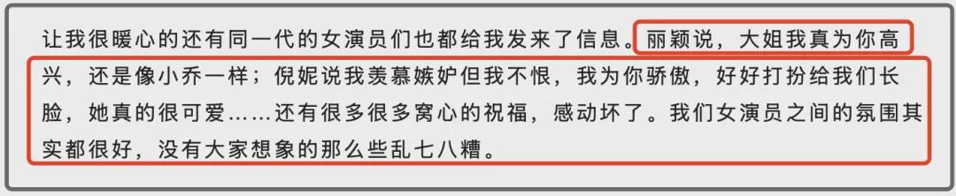 除了好友名导给自己送祝福,还让辛芷蕾感动的是同一时代的女演员们也都给自己发来了信息,赵丽颖说自己真心为辛芷蕾感到高兴,倪妮说自己羡慕嫉妒但是不恨,她为辛芷蕾感到骄傲。除了这两位,其实还有很多很多的祝福,让辛芷蕾很是感动。尤其辛芷蕾还强调,其实女演员之间的氛围都很好,没有大家想的那么乱七八糟。