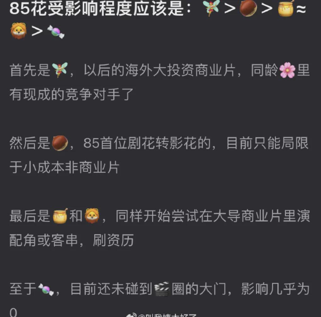 据悉,在辛芷蕾拿到影后没过多久,就有博主进行了一波分析,称85花的格局要变了,洗牌过后现在变成了刘亦菲、辛芷蕾、杨幂与赵丽颖,给这几位进行所谓的洗牌与排名,颇有点拉踩的意思。