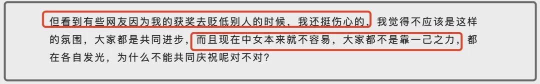 不过用辛芷蕾的话来说,女演员之间的氛围很好,大概率也不会因为这些所谓的排名而受到影响,并且辛芷蕾还表示,看到网上有人因为自己获奖而去贬低别人,其实是很伤心的,她觉得不应该是这种氛围,大家都很优秀,尤其是现在中年女星本来就不容易,都在各自发光,为什么就不能共同庆祝呢?