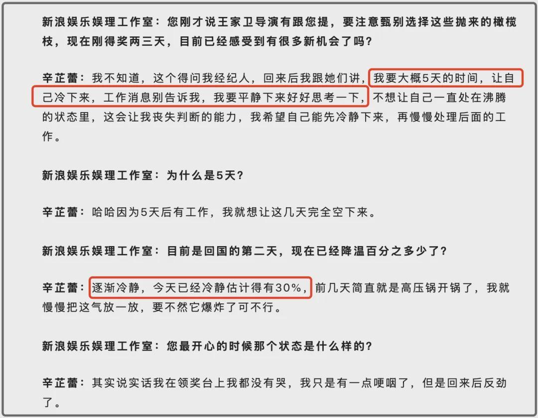 作为继巩俐、叶德娴之后的第三位华人威尼斯影后,辛芷蕾获奖后却并没有像大家想象中的那样行程满满,活动铺天盖地。而是给自己稍微放了一个小长假,通过媒体,讲述了拿到影后这几天的感受。